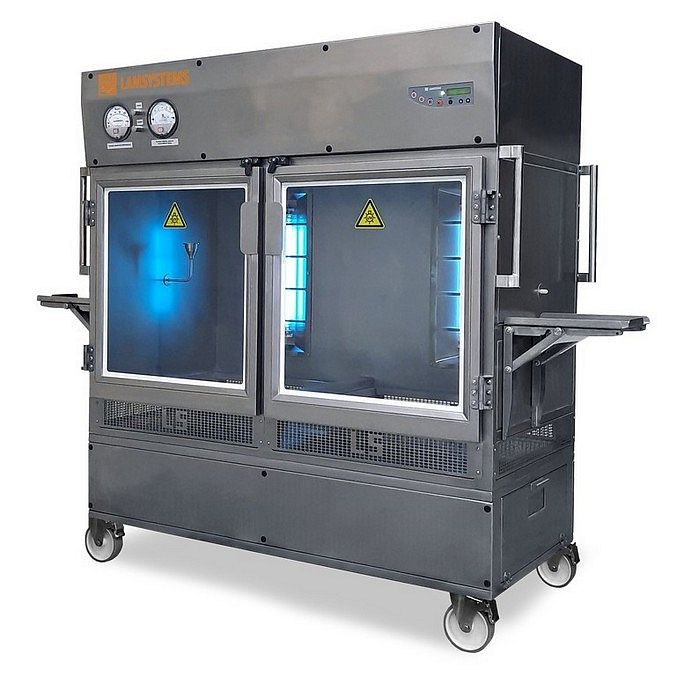 Мобильная тележка с вертикальным ламинарным потоком предназначена для автономного использования, когда необходима защита предметов и материалов внутри рабочей камеры от внешних и перекрестных загрязнений, в условиях беспылевой воздушной среды и транспортировки этих материалов внутри тележки из одного помещения в другое без необходимости подключать тележку к электрической сети.