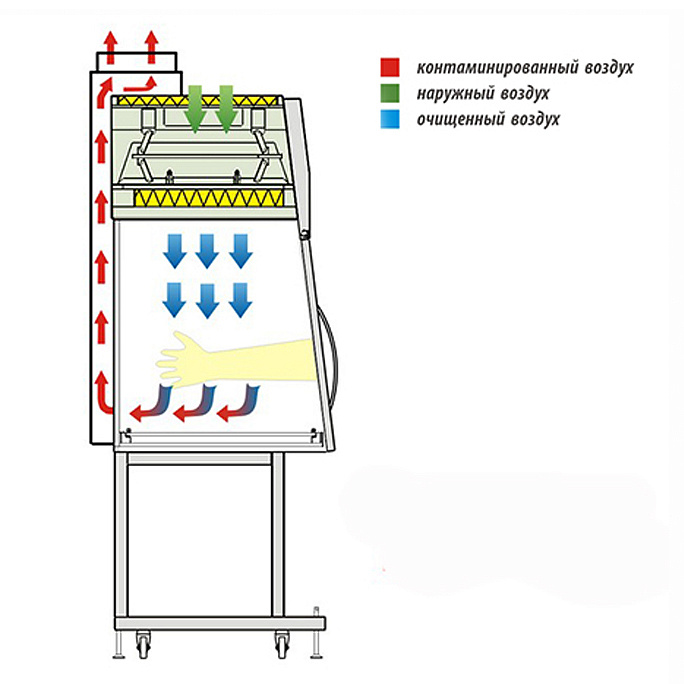 - Рабочая камера приспособлена к очистке и дезинфекции: имеет скругленные углы, лампу УФ-облучения и съемный блок розеток с внешним выключателем питания. Специальный режим уборки позволяет осуществлять обработку рабочих поверхностей при включенных вентиляторах.