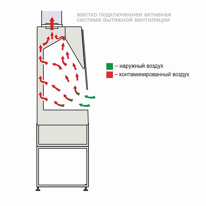 - Рабочая камера приспособлена к очистке и дезинфекции: имеет скругленные углы, лампу УФ-облучения и съемный блок розеток с внешним выключателем питания. Специальный режим уборки позволяет осуществлять обработку рабочих поверхностей при включенных вентиляторах.