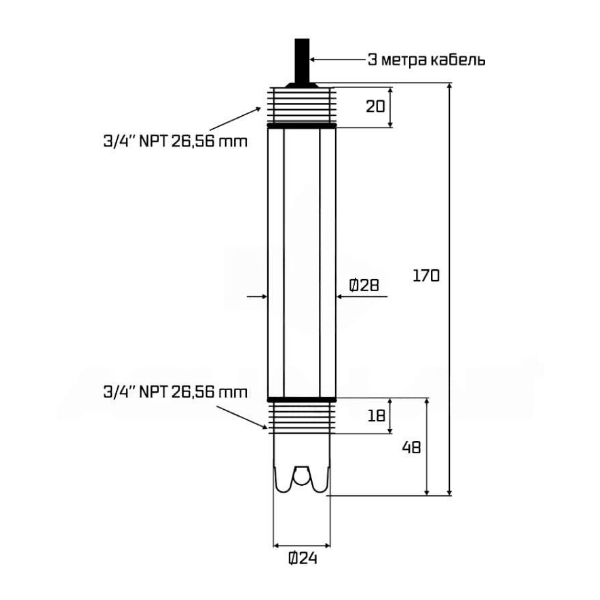 - Стандартный кабель длиной 3 метра и универсальный монтаж 3/4″ NTP упрощают установку и интеграцию датчика в измерительные системы.