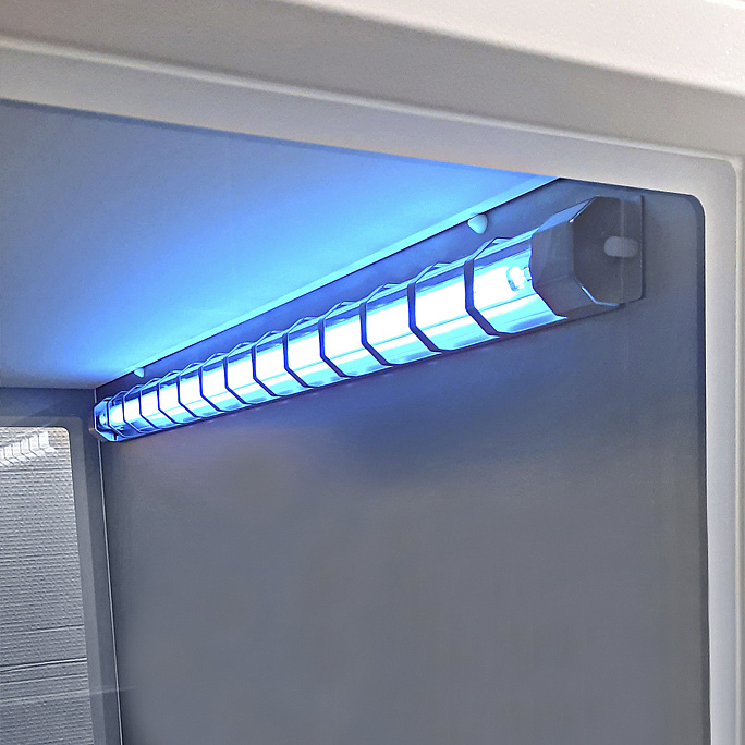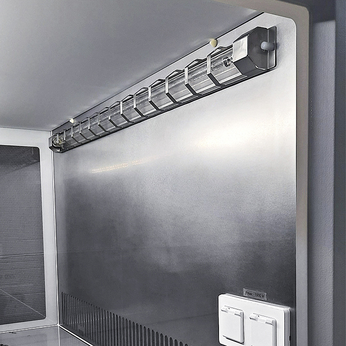 - блок УФ-облучения расположен в верхней части задней стенки рабочей камеры и защищен кожухом из нержавеющей стали.