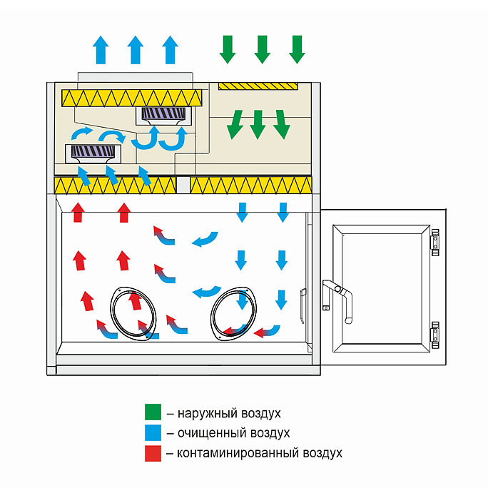 - очистка воздуха, поступающего в рабочую камеру, двухступенчатая: происходит через предварительный фильтр грубой очистки G4 и приточный НЕРА-фильтр Н14, расположенный над рабочей камерой;