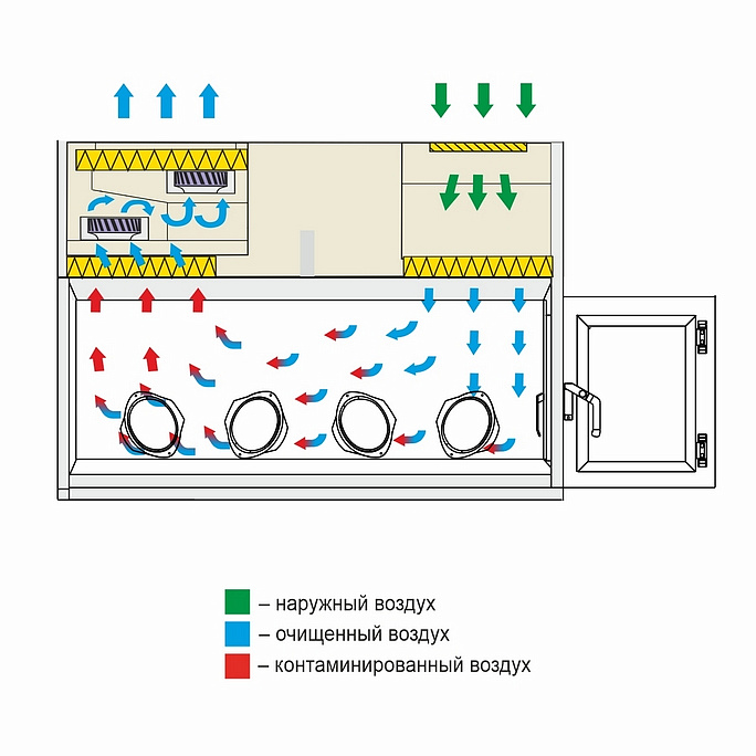 - очистка воздуха, поступающего в рабочую камеру, двухступенчатая: происходит через предварительный фильтр грубой очистки G4 и приточный НЕРА-фильтр Н14, расположенный над рабочей камерой;
