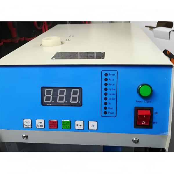 Нажать кнопку (11) «Manual/Auto» с удержанием до появления звукового сигнала и появления индикации напротив надписи «Manual» на панели индикации (9). Нажатием кнопки (12) «Up» поднять вверх чашу, в конечном положении привод остановиться автоматически. Для включения малой скорости вращения нажать кнопку (13) «Low Speed», для включения большой скорости вращения нажать кнопку (14) «High Speed». Для подачи песка в чашу нажать кнопку (10) «+Sand». Для остановки процесса нажать кнопку (11) «Stop», чаша опустится автоматически до крайнего нижнего положения. Для принудительного опускания чаши использовать кнопку (11) «Down».