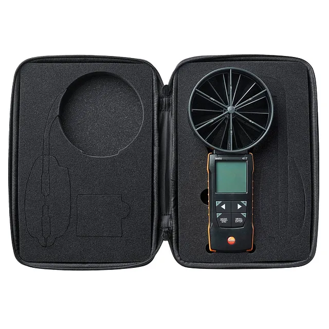 - В дополнение к двум измерительным воронкам в комплект testo 417 Kit 2 входит выпрямитель объемного потока, позволяющий получать точные результаты даже в вихревых диффузорах.