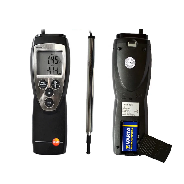 - Конструкционно Testo 425 представляет собой малогабаритный электронный блок с кнопками управления и дисплеем (оснащенным подсветкой), к которому постоянно подключен (с помощью гибкого кабеля) измерительный зонд с обогреваемой струной. Компактность конструкции обеспечивает удобство транспортировки прибора и необременительность его переноски в ходе работ.